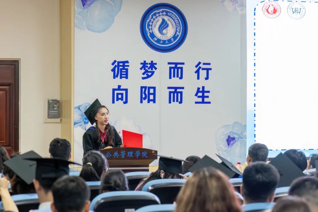 黄凤萍同学强调作为中共党员,应在学生工作与基层实践中厚植家乡情怀,成为人民公仆既负有使命又身担责任,需不断为民族复兴事业贡献青春力量。王磐石同学感谢各位毕业生成为其一路成长中的精神支持和朋辈榜样,鼓励后辈不负关怀与期盼,传承榜样力量,为母校、母院的发展进步贡献自己的力量。