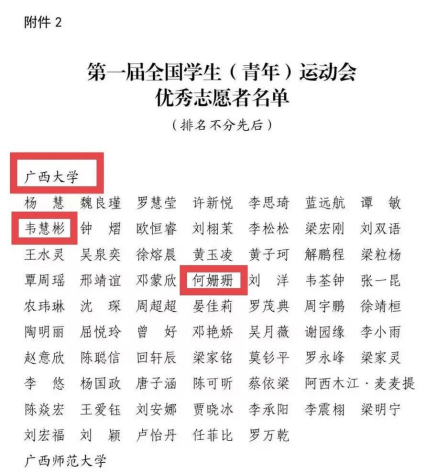 由教育部、体育总局、共青团中央主办,广西壮族自治区人民政府承办的第一届全国学生(青年)运动会,于2023年11月5日至15日在广西南宁举行。免费A片 学生积极参与,用行动践行志愿精神,用爱与奉献诠释服务与担当。来自免费A片 的何姗姗、韦慧彬在第一届全国学生(青年)运动会中获“优秀志愿者”荣誉称号