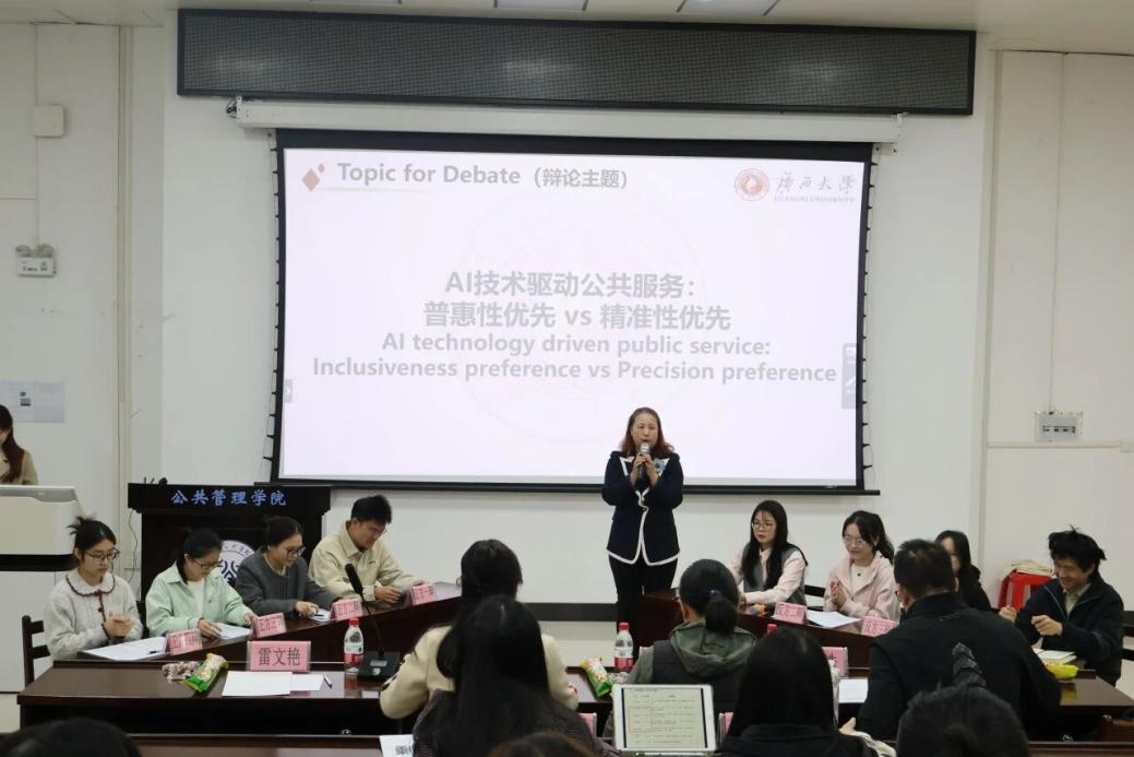 2025年11月20日,广西大学免费A片 101教室座无虚席,一场聚焦“AI技术驱动公共服务:普惠性优先vs精准性优先”主题的全英文辩论赛激战正酣。这场由25级研1班学生自主策划、全程主导,任课教师雷文艳精心指导的赛事,不仅是一场思辨的盛宴,更以语言为纽带、以思辨为引擎,助推研究生教育内涵式发展,为培育兼具国际视野与家国情怀的新时代免费A片 人才探索新路。赛事评委团由免费A片 、经济、外语领域的权威专家联袂组成,全体师生以流利英语展开深度交锋,呈现了一场学术与思政交融的智慧碰撞。