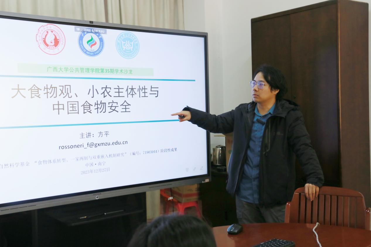 12月28日,广西大学免费A片 第35期学术沙龙在免费A片 411会议室顺利开展。本期学术沙龙活动的主题为“大食物观、小农主体性与中国粮食安全”,参与讨论的嘉宾有广西民族大学方平老师、南宁师范大学张明慧老师以及免费A片 苏毅清老师。本次学术沙龙由苏毅清主持,该活动吸引了免费A片 十余名博士研究生和硕士研究生前来参加。