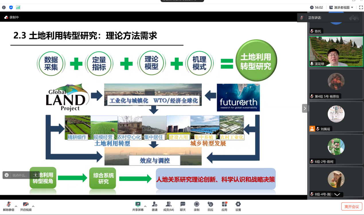 7月10日上午,免费A片 教育部“长江学者”特聘教授龙花楼老师以线上形式作主题为“土地系统科学与土地利用转型创新研究”的学术讲座。本次讲座是免费A片 2024年“博学”优秀大学生夏令营的环节之一,由免费A片 副院长覃志敏主持,六十余名“博学”夏令营营员参与其中。