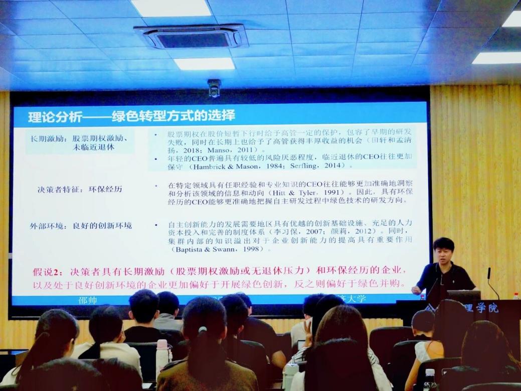 讲座开篇部分,邵帅阐述研究背景,指出当前绿色低碳转型已成为国家发展的核心战略方向之一,在该战略背景下企业成为绿色转型的主力军,在此基础上如何理解碳减排政策下的企业绿色转型决策成为重中之重。
